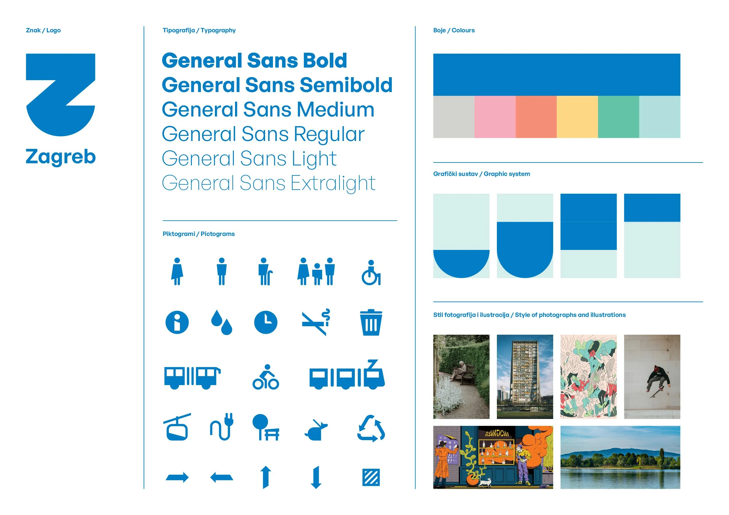 Tipografski sustav koji prati taj znak mora biti fleksibilan i primjenjiv u svim dijelovima identiteta, od signalizacije, preko plakata, do knjižnih prijeloma. Karakter znaka nalaže bezserifnu tipografiju geometrijske konstrukcije čiji će oblici biti nasljednici hrabrog razdoblja ’50-ih i ’60-ih, ali istovremeno pružati suvremeni dojam. Mora imati mnogo rezova i posebnih znakova i biti dostupno za slobodno preuzimanje. Naš izbor je General Sans (Indian Type Foundry, dostupno preko Fontshare™). Koloristička shema identiteta sastavljena je od jedne primarne i 6 dopunskih boja. Primarna boja identiteta je plava. Mi predlažemo tramvajski plavu boju, jer su tramvaji među zadnjim javnim podlogama na kojima se plava boja još uvijek može vidjeti, pa su oni s vremenom postali nositelji "zagrebačke plave". Osim toga, plava boja korištena na grbu također je jasna, nebeskoplava boja, a ta nijansa nije uobičajen izbor za identitete gradova i u sebi nosi suvremenu svježinu. Plava boja koristi se za znak i logotip i sve tekstualne elemente kad god je to moguće. Odabir dopunskih boja predstavljao je pravi užitak. Iskoristile smo priliku da u identitet uključimo zagrebačku arhitekturu, biljni i životinjski svijet. Ima ih 6, a namijenjene su korištenju za sve ostale elemente (podloge, piktograme i infografike).