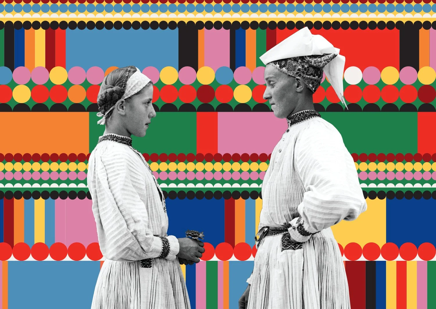 Kolaž i ilustracija umjetničke su tehnike koje su oduvijek prepoznatljiv dio našeg izričaja, i objeručke smo prihvatile dopuštenje da zagrabimo u ovu jedinstvenu arhivu fotografija. Ona, osim nemjerljive dokumentarne vrijednosti, ima veliku umjetničku vrijednost. Pregledavanjem tog opusa naišle smo na nekoliko pravih malih remek-djela fotografske umjetnosti, a fotografija snimljena u selu Lasinja koja prikazuje djevojku i ženu jedna je od njih. Mi ne znamo točno tko su te dvije osobe, pretpostavljamo da su majka i kćer, ali ono što ovdje nadilazi vrijeme i prostor, i obraća nam se iz 1923. godine, je tiha, suspregnuta snaga, mirna i nepokolebljiva, koja se ostvaruje u prostoru i pogledima između ta dva generacijska arhetipa. I baš taj prostor i taj pogled pripovijedaju ono što je sama srž tradicije - oni govore o prenošenju znanja i vještina, ne samo praktičnog, već prije svega duhovnog znanja, bez kojega smo izgubljeni. Tu moćnu, prekrasnu stogodišnju fotografiju osvježili smo geometrijskom ilustracijom u živim bojama, sve redom preuzetima sa pokupskih nošnji, i suvremenom tipografijom.